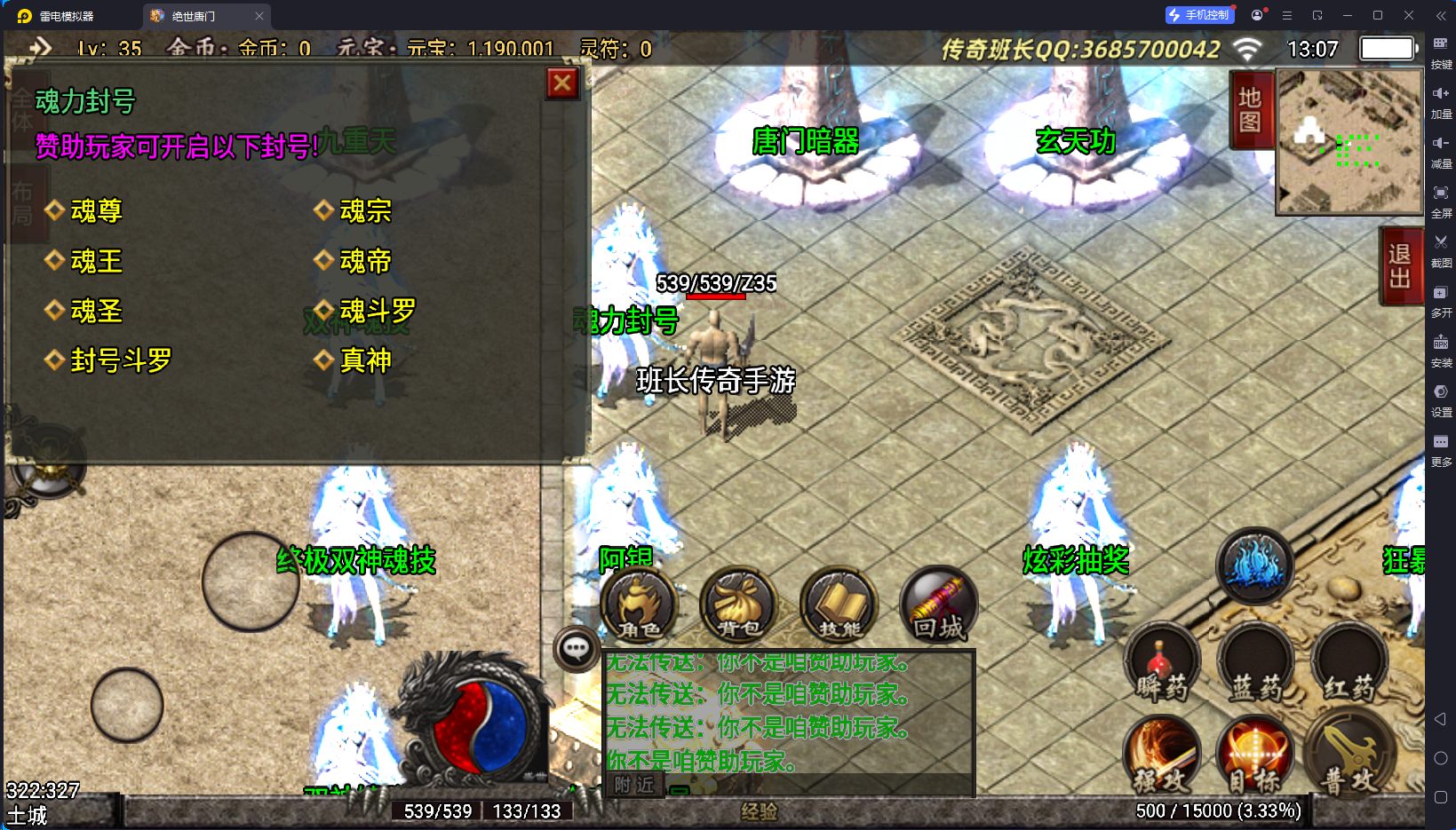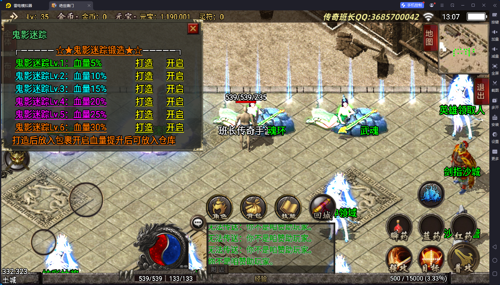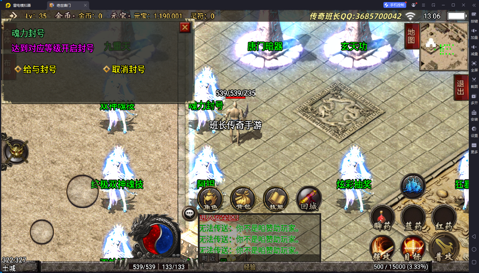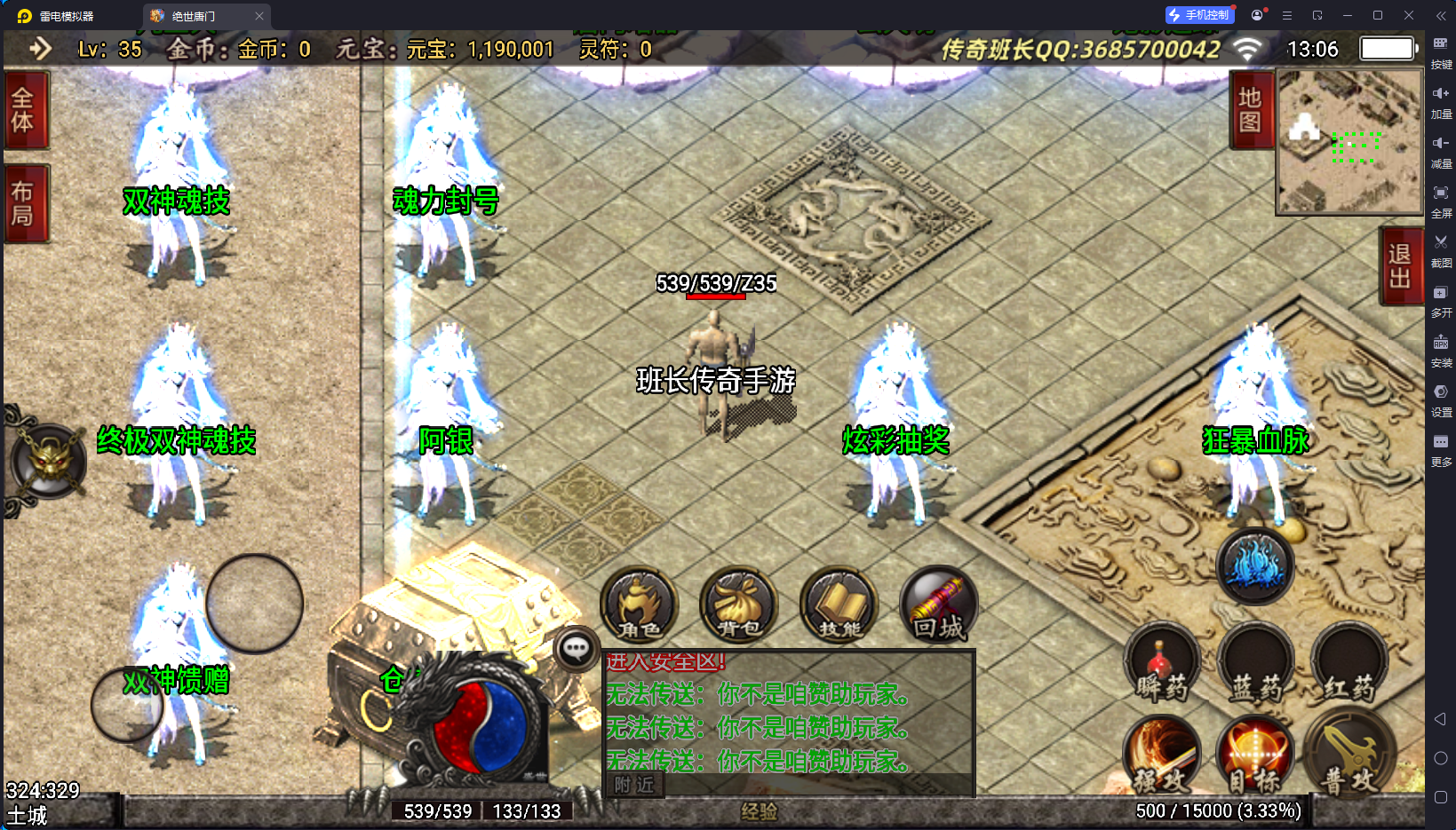 说完了版本的不足,版本的特色有2个方面,第一就是装备夸张,好看,有很多坐骑的衣服,属性极高,65535,这个已经是战神引擎的极限数据了,还要就是游戏里面的那些帮主啃看不懂,玩不来的NPC功能,比如武魂、暗器、玄天功、鬼影迷踪、魂环、还要战士的新技能,这些都是比较有特殊的,你们可以下载来研究一下。其他的细节自己架设进去测试。