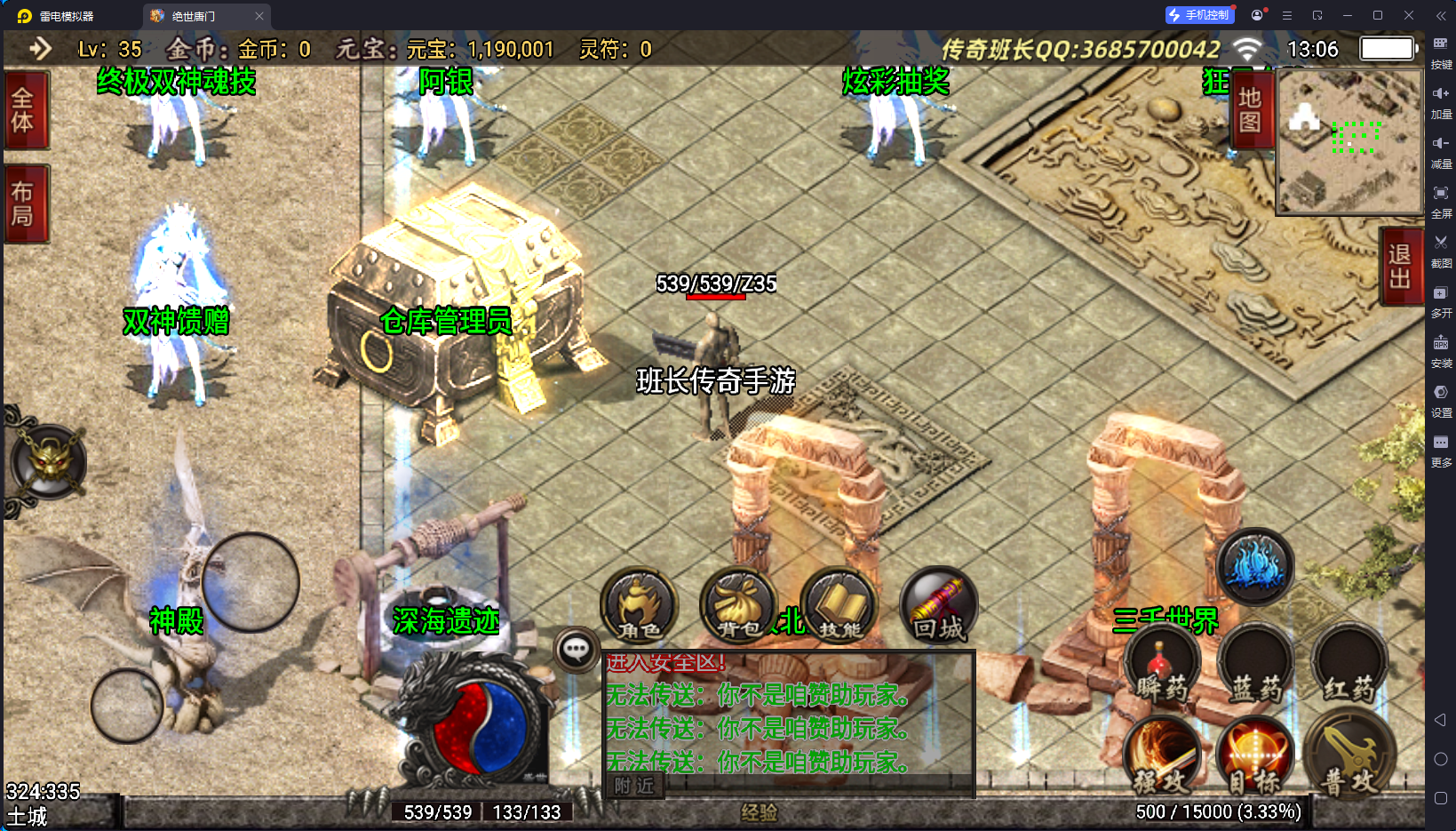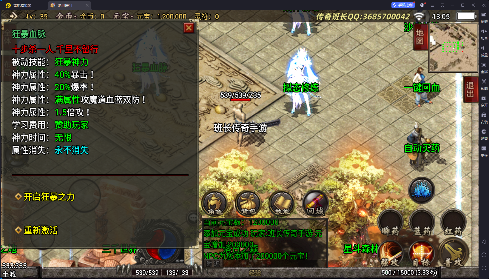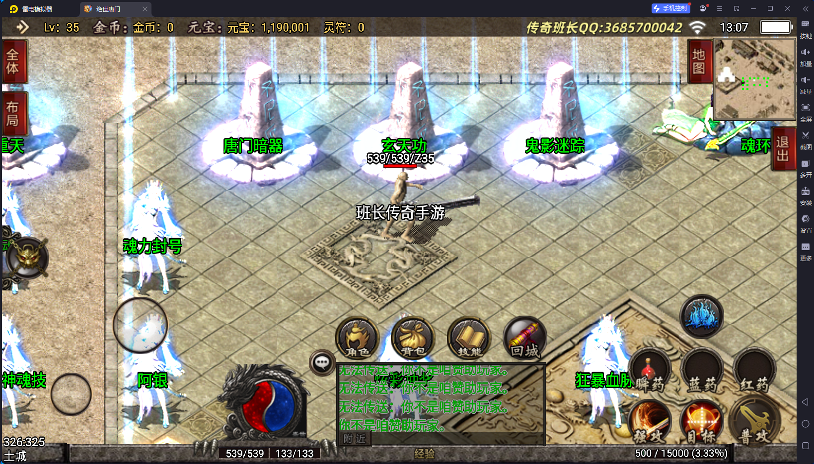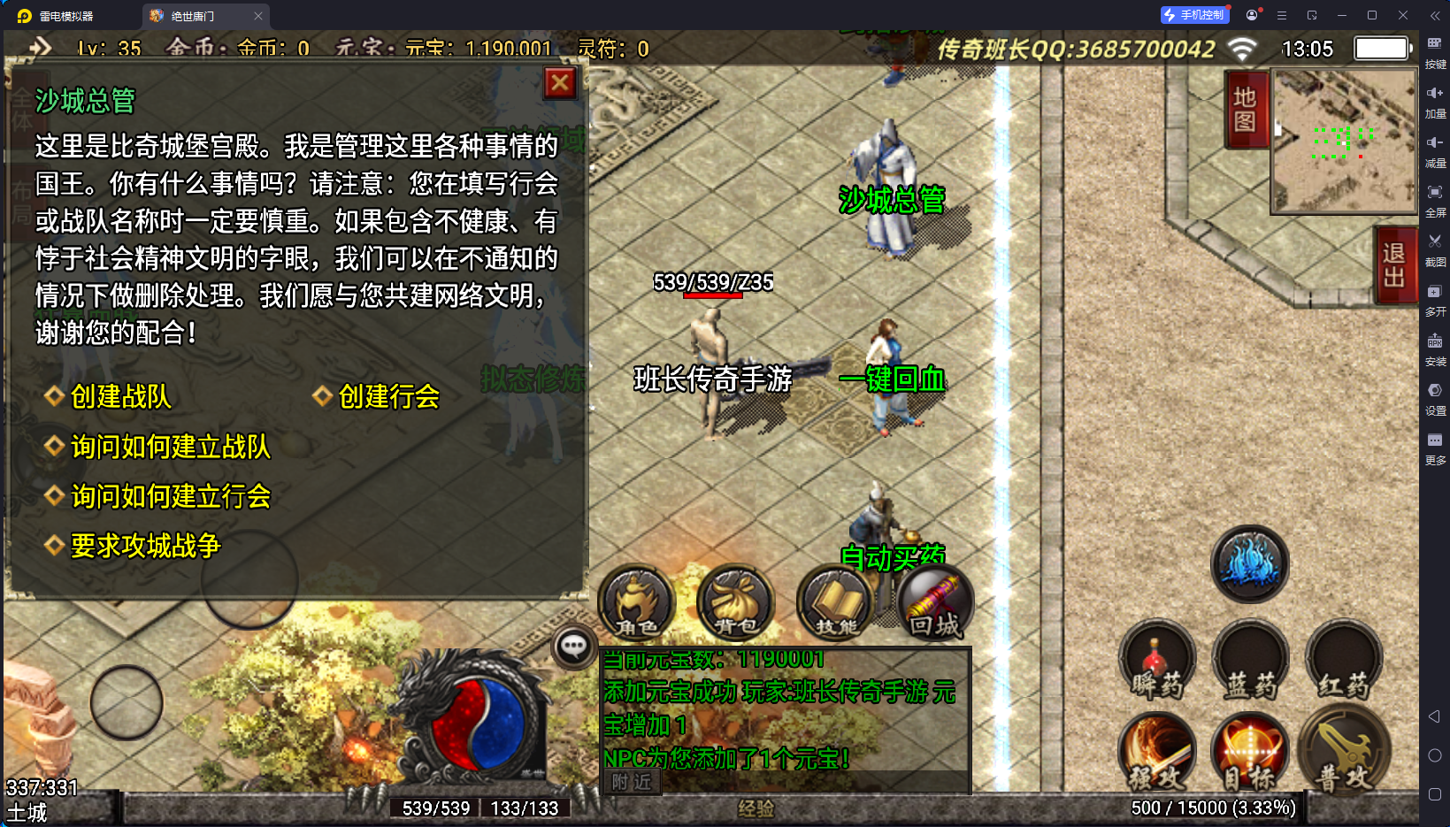 说完了版本的不足,版本的特色有2个方面,第一就是装备夸张,好看,有很多坐骑的衣服,属性极高,65535,这个已经是战神引擎的极限数据了,还要就是游戏里面的那些帮主啃看不懂,玩不来的NPC功能,比如武魂、暗器、玄天功、鬼影迷踪、魂环、还要战士的新技能,这些都是比较有特殊的,你们可以下载来研究一下。其他的细节自己架设进去测试。