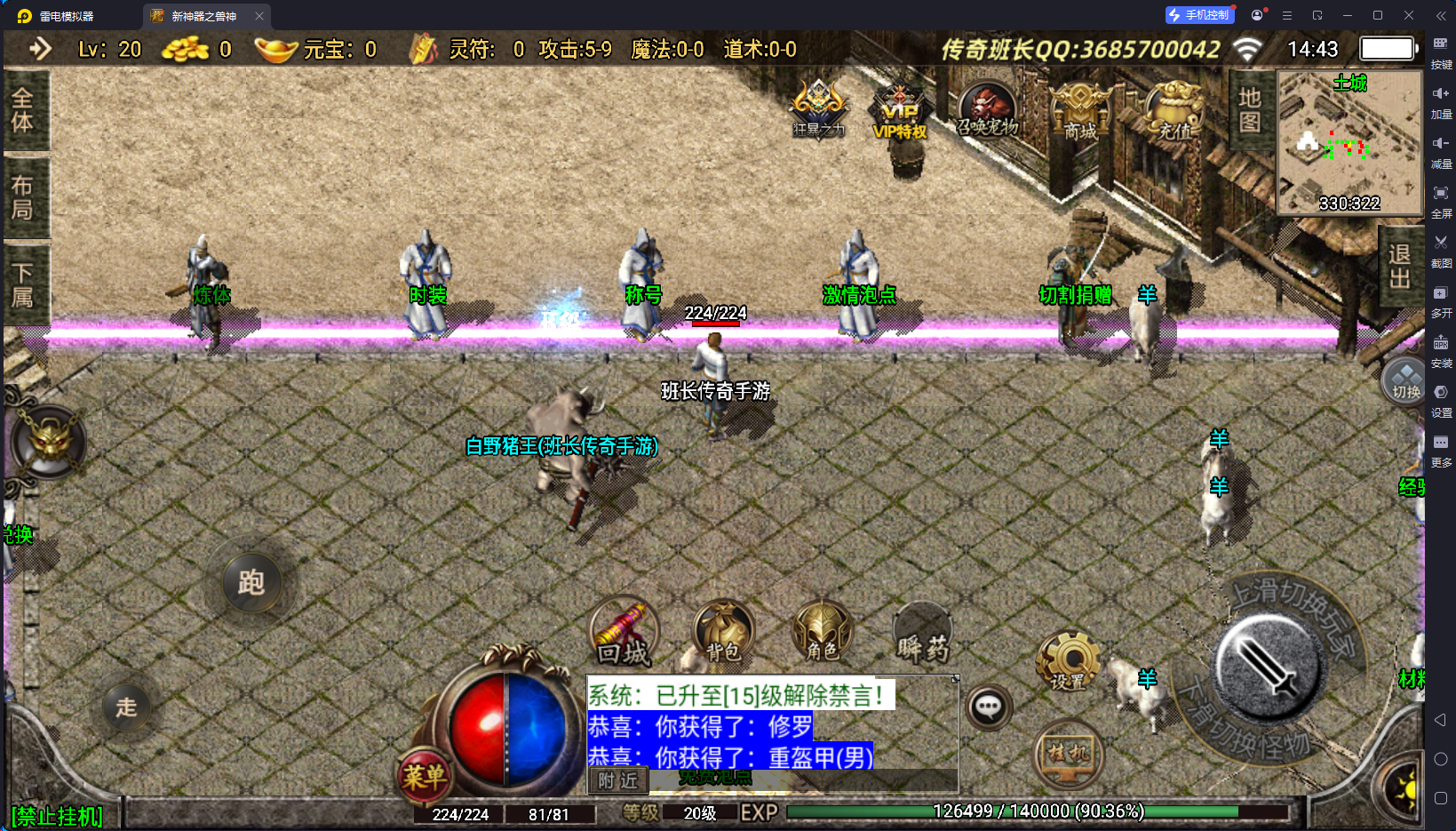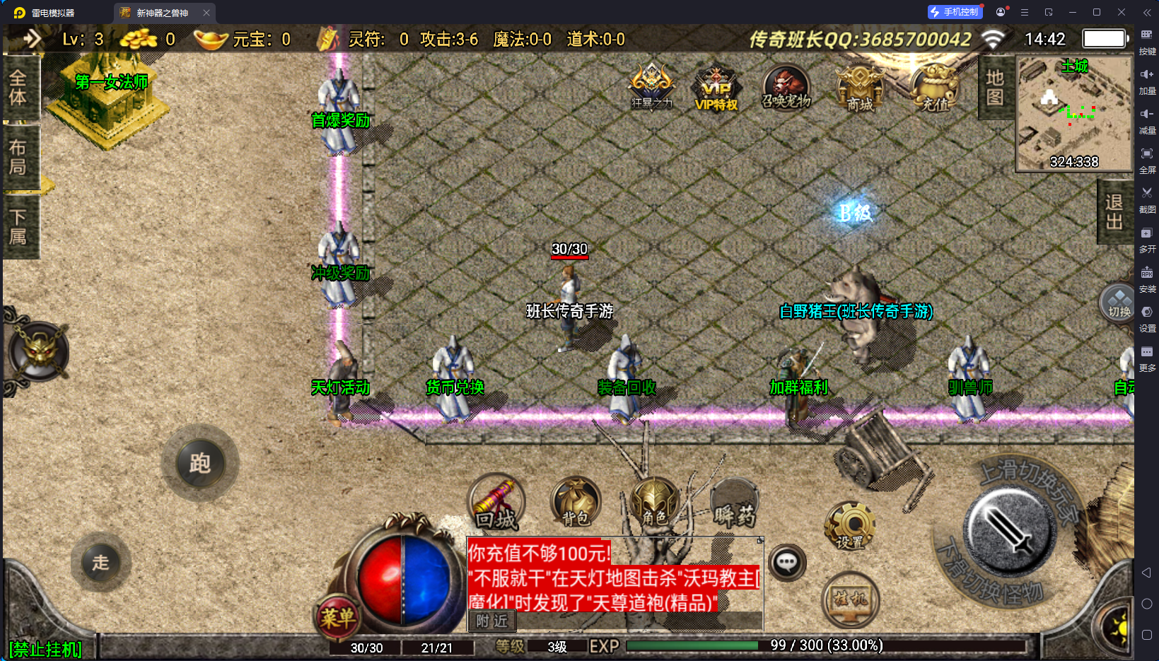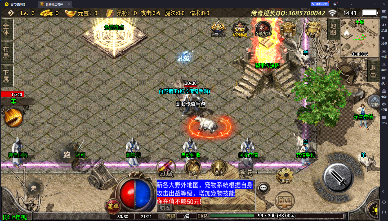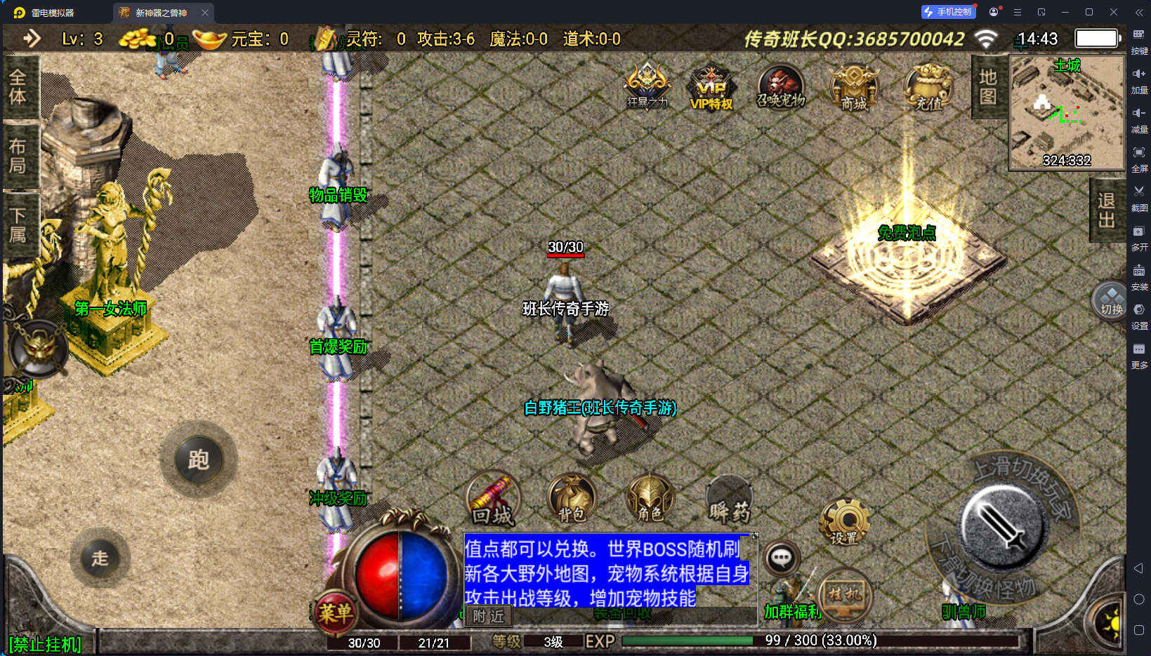 除了战士以为,给法道也做了对应的升级,这样三职业比较平衡,特色功能有时装合成、称号升级、狂暴、VIP特权,里面可以转换职业和性别,切割捐献等,经验抽奖,大转盘、战士召唤宠物、自动回收等等。还有很多,需要自己进来体验。版本设计的比较合理,玩家可以自己回收灵符获得充值点。版本带了配套的开区网站,盘古插件设置